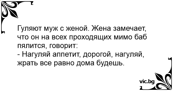 - Нагуляй аппетит, дорогой, нагуляй, жрать все равно дома будешь.