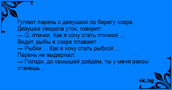 Гуляют парень с девушкой по берегу озера. Девушка увидела уток, говорит: — О, птички. Как я хочу стать птичкой ... Видит, рыбы в озере плавают — Рыбки ... Как я хочу стать рыбкой ... Парень не выдержал: — Погоди, до камышей дойдём, ты у меня раком станешь ...