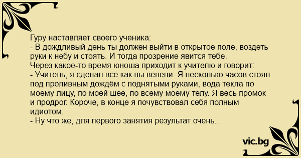 - Учитель, я сделал всё как вы велели. Я несколько часов стоял под проливным дождём с поднятыми руками, вода текла по моему лицу, по моей шее, по всему моему телу. Я весь промок и продрог. Короче, в конце я почувствовал себя полным идиотом.