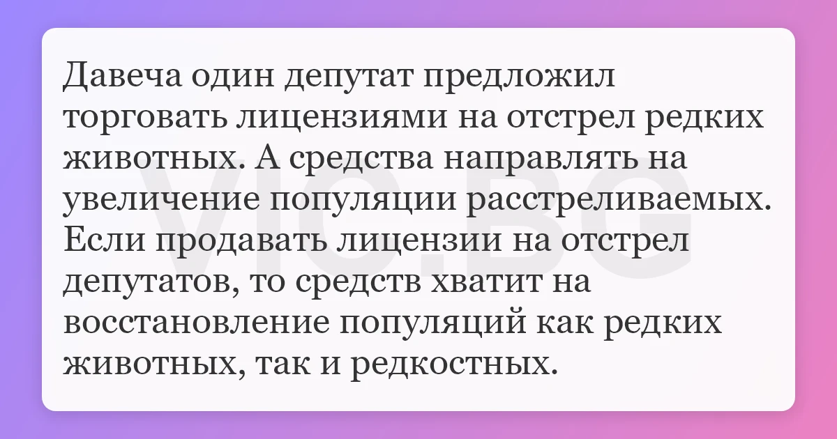 Если продавать лицензии на отстрел депутатов, то средств хватит на восстановление популяций как редких животных, так и редкостных.