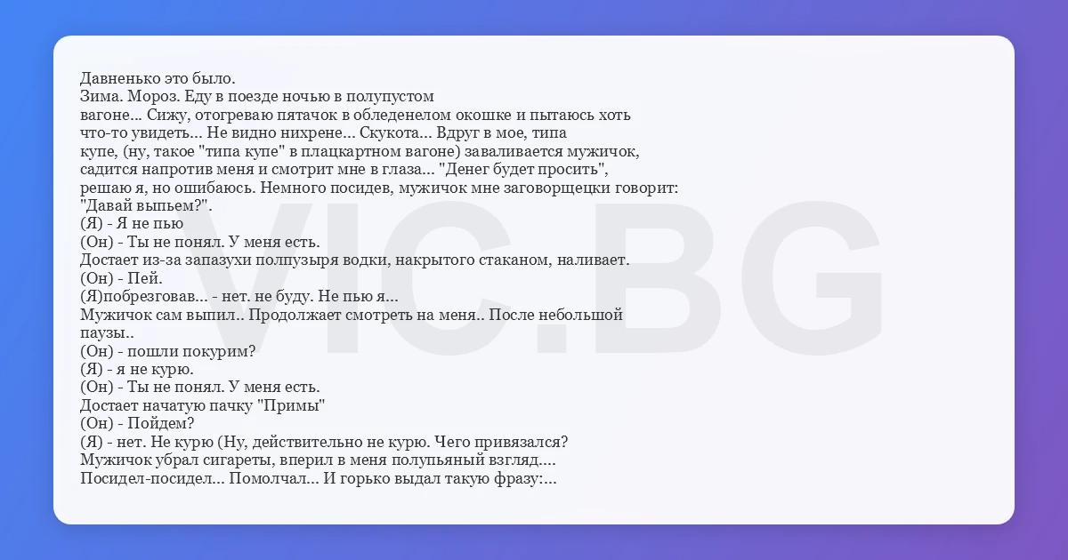 Давненько это было. Зима. Мороз. Еду в поезде ночью в полупустом вагоне... Сижу, отогреваю пятачок в обледенелом окошке и пытаюсь хоть что-то увидеть... Не видно нихрене... Скукота... Вдруг в мое, типа купе, (ну, такое "типа купе" в плацкартном вагоне) заваливается мужичок, садится напротив меня и смотрит мне в глаза... "Денег будет просить", решаю я, но ошибаюсь. Немного посидев, мужичок мне заговорщецки говорит: "Давай выпьем?". (Я) - Я не пью (Он) - Ты не понял. У меня есть. Достает из-за запазухи полпузыря водки, накрытого стаканом, наливает. (Он) - Пей. (Я)побрезговав... - нет. не буду. Не пью я... Мужичок сам выпил.. Продолжает смотреть на меня.. После небольшой паузы.. (Он) - пошли покурим? (Я) - я не курю. (Он) - Ты не понял. У меня есть. Достает начатую пачку "Примы" (Он) - Пойдем? (Я) - нет. Не курю (Ну, действительно не курю. Чего привязался? Мужичок убрал сигареты, вперил в меня полупьяный взгляд.... Посидел-посидел... Помолчал... И горько выдал такую фразу: "ВОТ ТЫ НЕ КУРИШЬ И НЕ ПЬЕШЬ... С ТОБОЙ И ПОГОВОРИТЬ-ТО НЕ О ЧЕМ..."