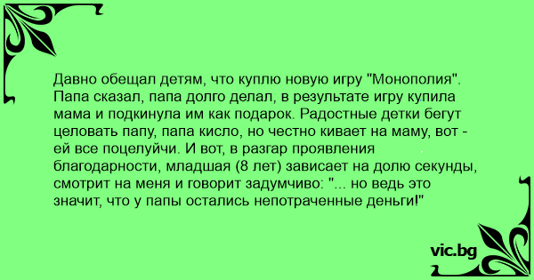 Папа сказал, папа долго делал, в результате игру купила мама и подкинула им как подарок. Радостные детки бегут целовать папу, папа кисло, но честно кивает на маму, вот - ей все поцелуйчи. И вот, в разгар проявления благодарности, младшая (8 лет) зависает на долю секунды, смотрит на меня и говорит задумчиво: "... но ведь это значит, что у папы остались непотраченные деньги!"