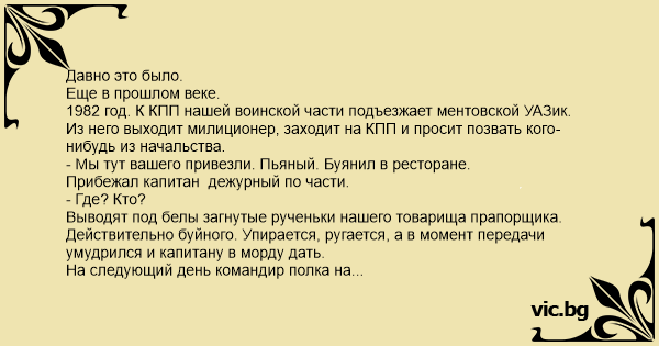 1982 год. К КПП нашей воинской части подъезжает ментовской УАЗик. Из него выходит милиционер, заходит на КПП и просит позвать кого-нибудь из начальства.