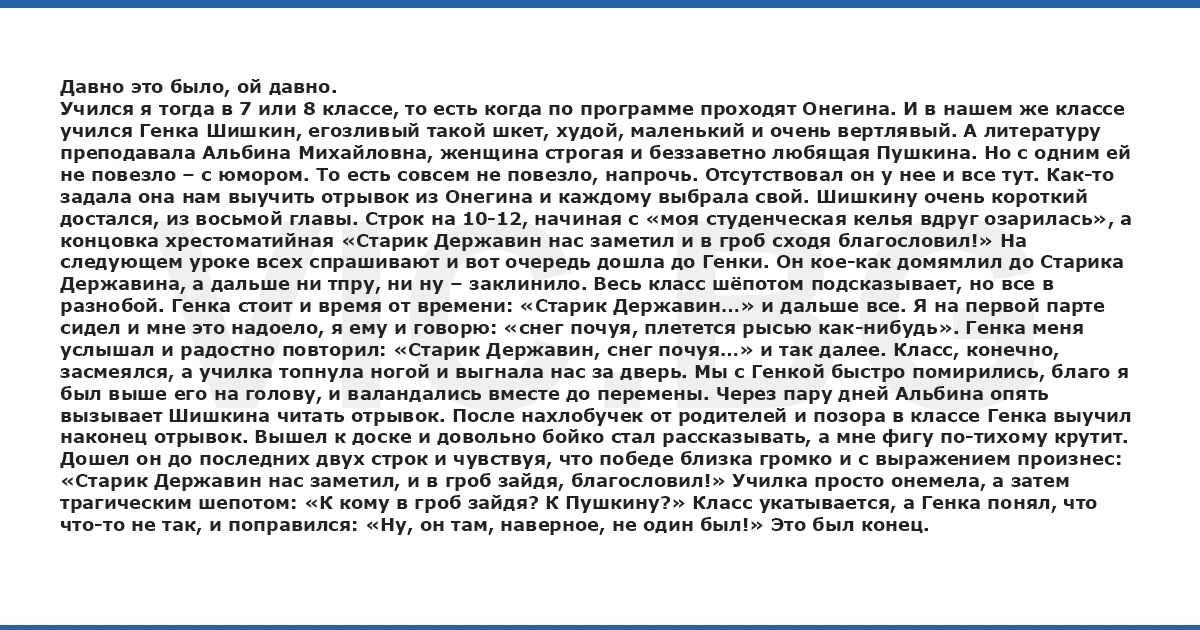Учился я тогда в 7 или 8 классе, то есть когда по программе проходят Онегина. И в нашем же классе учился Генка Шишкин, егозливый такой шкет, худой, маленький и очень вертлявый. А литературу преподавала Альбина Михайловна, женщина строгая и беззаветно любящая Пушкина. Но с одним ей не повезло – с юмором. То есть совсем не повезло, напрочь. Отсутствовал он у нее и все тут. Как-то задала она нам выучить отрывок из Онегина и каждому выбрала свой. Шишкину очень короткий достался, из восьмой главы. Строк на 10-12, начиная с «моя студенческая келья вдруг озарилась», а концовка хрестоматийная «Старик Державин нас заметил и в гроб сходя благословил!» На следующем уроке всех спрашивают и вот очередь дошла до Генки. Он кое-как домямлил до Старика Державина, а дальше ни тпру, ни ну – заклинило. Весь класс шёпотом подсказывает, но все в разнобой. Генка стоит и время от времени: «Старик Державин…» и дальше все. Я на первой парте сидел и мне это надоело, я ему и говорю: «снег почуя, плетется рысью как-нибудь». Генка меня услышал и радостно повторил: «Старик Державин, снег почуя…» и так далее. Класс, конечно, засмеялся, а училка топнула ногой и выгнала нас за дверь. Мы с Генкой быстро помирились, благо я был выше его на голову, и валандались вместе до перемены. Через пару дней Альбина опять вызывает Шишкина читать отрывок. После нахлобучек от родителей и позора в классе Генка выучил наконец отрывок. Вышел к доске и довольно бойко стал рассказывать, а мне фигу по-тихому крутит. Дошел он до последних двух строк и чувствуя, что победе близка громко и с выражением произнес: «Старик Державин нас заметил, и в гроб зайдя, благословил!» Училка просто онемела, а затем трагическим шепотом: «К кому в гроб зайдя? К Пушкину?» Класс укатывается, а Генка понял, что что-то не так, и поправился: «Ну, он там, наверное, не один был!» Это был конец.