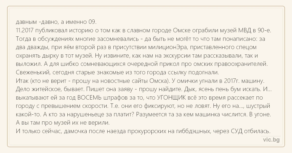 11.2017 публиковал историю о том как в славном городе Омске ограбили музей МВД в 90-е. Тогда в обсуждениях многие засомневались - да быть не могёт то что там понаписано: за два дважды, при яём второй раз в присутствии милиционЭра, приставленного спецом охранять дырку в тот музей. Ну извините, как нам на экскурсии там рассказывали, так и выложил. А для шибко сомневающихся очередной прикол про омских правоохранителей. Свеженький, сегодня старые знакомые из того города ссылку подогнали.