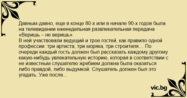 В ней участвовали ведущий и трое гостей, как правило одной профессии: три артиста, три моряка, три строителя… По очереди каждый гость должен был рассказать каждому другому какую-нибудь увлекательную историю, которая в соответствии с не известным слушателю жребием должна была оказаться либо правдой, либо выдумкой. Слушатель должен был это угадать. Уже после нескольких первых передач стало ясно, что участники заготавливают только правдивые истории, а если по жребию надо рассказать вымысел, то рассказчик чаще всего меняет какую-нибудь деталь в финале. Например, говорит «потом они поженились и жили долго и счастливо» вместо «но через месяц они расстались и больше никогда не встречались».