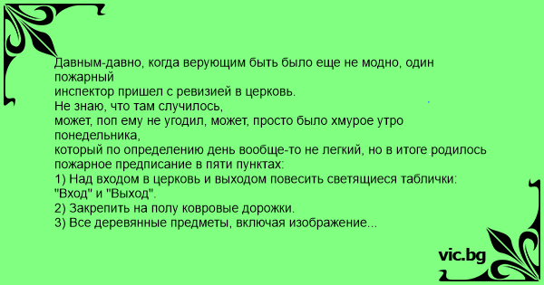 Давным-давно, когда верующим быть было еще не модно, один пожарный инспектор пришел с ревизией в церковь.