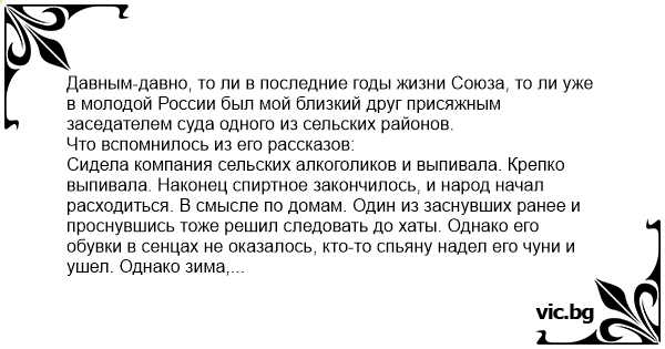 Давным-давно, то ли в последние годы жизни Союза, то ли уже в молодой России был мой близкий друг присяжным заседателем суда одного из сельских районов. Что вспомнилось из его рассказов: Сидела компания сельских алкоголиков и выпивала. Крепко выпивала. Наконец спиртное закончилось, и народ начал расходиться. В смысле по домам. Один из заснувших ранее и проснувшись тоже решил следовать до хаты. Однако его обувки в сенцах не оказалось, кто-то спьяну надел его чуни и ушел. Однако зима, холодно. Человек одевает какую-то хозяйскую обувь и уходит по своим делам. Утром хозяин проснувшись обнаружил отсутствие обуви и с похмела вызвал участкового. Дело закрутилось Похитителя нашли быстро, да он и не отпирался. Завели уголовное дело и похититель отсидел до суда в КПЗ ГОД. На суде в связи с мелким хищением надо бы отпускать человека. Но ведь он будет требовать компенсации. В итоге он получил год за кражу и с учетом предварительного заключения его освободили в зале суда. Но судимость и испорченная биография остались. Хотя в деревне нахрен ему это все надо, только при разрешении на оружие должны быть проблемы.