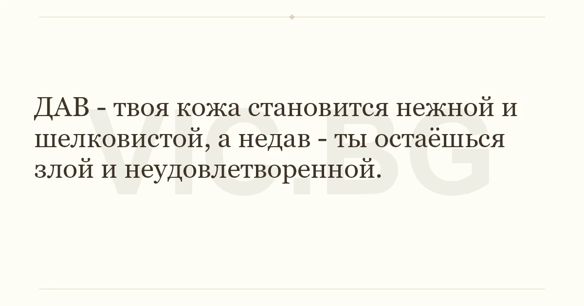 ДАВ - твоя кожа становится нежной и шелковистой, а недав - ты остаёшься злой и неудовлетворенной. 20 0 0 Анекдоты