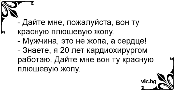 14 лютого. У крамниці: - Дайте мені, будь ласка, ту червону плюшеву дупу. - Чоловік, це не дупа, а серце! - Знаєте, я 20 років кардіохірургом працюю. Дайте мені ту червону плюшеву дупу.