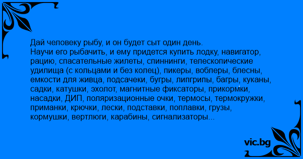 Научи его рыбачить, и ему придется купить лодку, навигатор, рацию, спасательные жилеты, спиннинги, телескопические удилища (с кольцами и без колец), пикеры, воблеры, блесны, емкости для живца, подсачеки, бугры, липгрипы, багры, куканы, садки, катушки, эхолот, магнитные фиксаторы, прикормки, насадки, ДИП, поляризационные очки, термосы, термокружки, приманки, крючки, лески, подставки, поплавки, грузы, кормушки, вертлюги, карабины, сигнализаторы поклёвки, аэраторы, горелки, обогреватели, якорную намотку, холодильную сумку, плиту газовую, газ, накомарники, сапоги, перчатки, дождевик, камуфляжную одежду, куртку, палатку, сухое горючее, туристическую посуду, стулья, матрас, коврики, средства для розжига, свечи и ещё 387 вещей, которые совершенно необходимы на рыбалке, чтобы спокойно сидеть и пить пиво целый день.