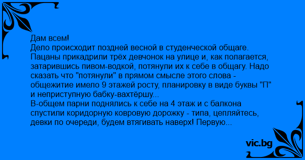 Дело происходит поздней весной в студенческой общаге. Пацаны прикадрили трёх девчонок на улице и, как полагается, затарившись пивом-водкой, потянули их к себе в общагу. Надо сказать что "потянули" в прямом смысле этого слова - общежитие имело 9 этажей росту, планировку в виде буквы "П" и неприступную бабку-вахтёршу...