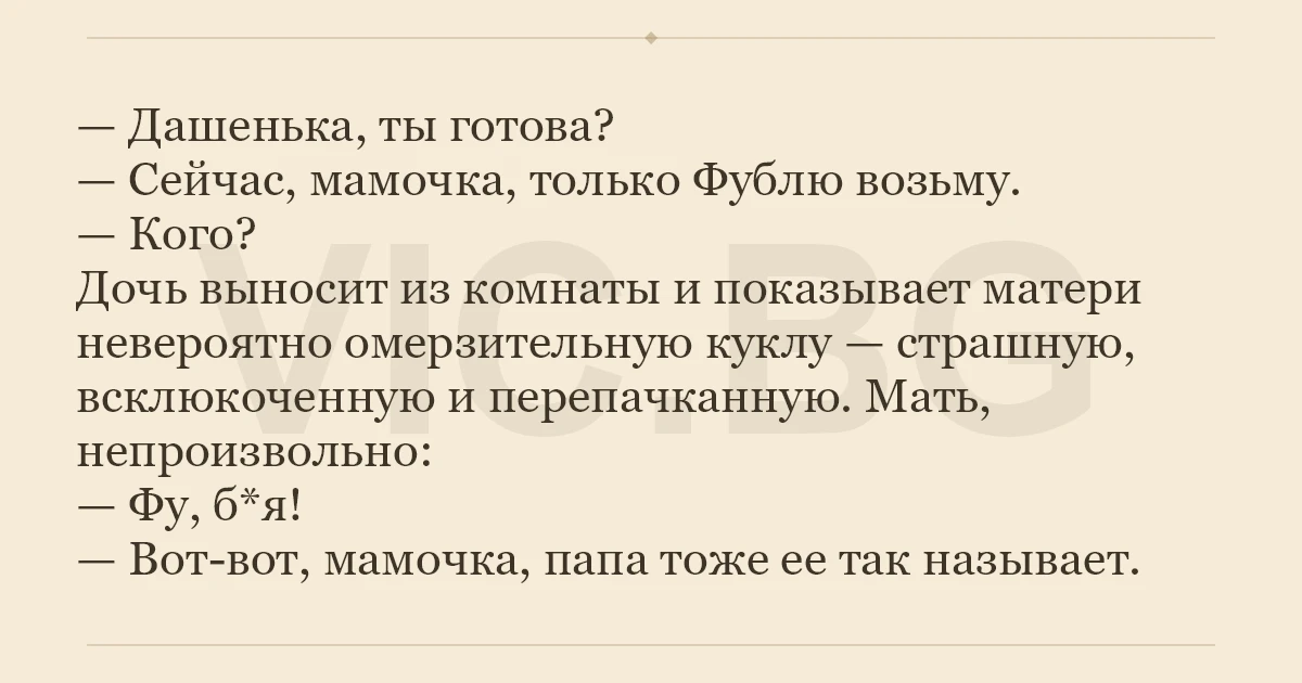 Дочь выносит из комнаты и показывает матери невероятно омерзительную куклу — страшную, всклюкоченную и перепачканную. Мать, непроизвольно: