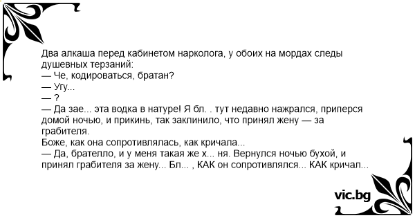 — Да, брателло, и у меня такая же х... ня. Вернулся ночью бухой, и принял грабителя за жену... Бл... , КАК он сопротивлялся... КАК кричал...