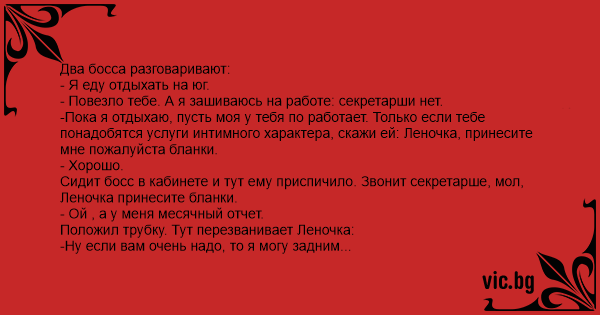 -Пока я отдыхаю, пусть моя у тебя по работает. Только если тебе понадобятся услуги интимного характера, скажи ей: Леночка, принесите мне пожалуйста бланки.