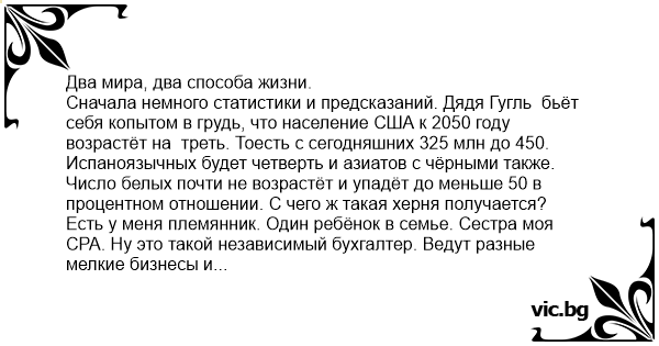 Сначала немного статистики и предсказаний. Дядя Гугль бьёт себя копытом в грудь, что население США к 2050 году возрастёт на треть. Тоесть с сегодняшних 325 млн до 450. Испаноязычных будет четверть и азиатов с чёрными также. Число белых почти не возрастёт и упадёт до меньше 50 в процентном отношении. С чего ж такая хepня получается?