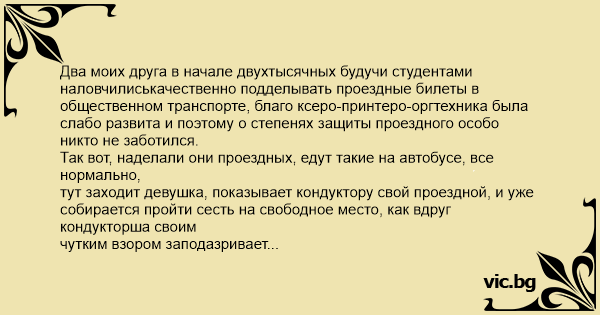 Два моих друга в начале двухтысячных будучи студентами наловчилиськачественно подделывать проездные билеты в общественном транспорте, благо ксеро-принтeро-оргтехника была слабо развита и поэтому о степенях защиты проезднoго особо никто не заботился. Так вот, наделали они проездных, едут такие на автобусе, все нормально, тут заходит девушка, показывает кондуктору свой проездной, и уже собирается пройти сесть на свободное место, как вдруг кондукторша своим чутким взором заподазривает подделку, начинается скандал, громкие крики, размахивание руками. Кондукторша поворачивается в сторону моих друзей, и грозно так: - Ну-ка дайте сюда ваши проездные. У тех душа в пятки, в головах проскакивают номера уголовных статей за подделку документов. Кондукторша тычет ихними проездными в лицо девушке и орет: - Вот какие должны быть настоящие проездные!
