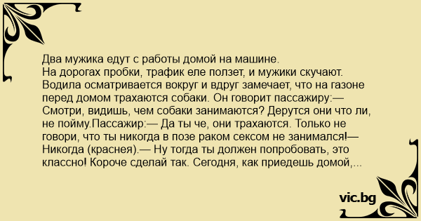 На дорогах пробки, трафик еле ползет, и мужики скучают. Водила осматривается вокруг и вдруг замечает, что на газоне перед домом трахаются собаки. Он говорит пассажиру:— Смотри, видишь, чем собаки занимаются? Дерутся они что ли, не пойму.Пассажир:— Да ты че, они трахаются. Только не говори, что ты никогда в позе раком сeкcом не занимался!— Никогда (краснея).— Ну тогда ты должен попробовать, это классно! Короче сделай так. Сегодня, как приедешь домой, сделай жене «Маргариту» и предложи попробовать новую сeкc-позу.Водитель подумал, и решил — почему бы и не попробовать!На следующее утро мужики встречаются снова. Пассажир, подмигивая:— Ну как вчера все прошло?Водитель:— Да все было ништяк, только одна заморока - мне пришлось жене шесть Маргарит сделать, пока она согласилась на газон перед домом выйти.