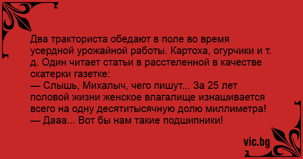 — Слышь, Михалыч, чего пишут... За 25 лет половой жизни женское влагалище изнашивается всего на одну десятитысячную долю миллиметра!