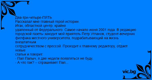 Два-три-четыре-ПЯТЬ Рассказал мне главный герой истории. Итак, областной центр, крайне удаленный от Федерального. Самое начало июня 2001 года. В редакцию городской газеты заходит мой приятель Петр Угланов, студент-вечерник филфака местного университета, подрабатывающий на жизнь внештатным сотрудничеством с прессой. Проходит к главному редактору, отдает новые статьи и говорит: - Пал Палыч, я две недели появляться не буду. - А что так? – спрашивает Пал Палыч. - Да экзамены начинаются, а у меня проблемы с истграмом (исторической грамматикой), надо посидеть над учебниками. - А кто у вас истграм ведет? -МарьВасильна Сочинская, этакая ведьма, которая любит зверствовать. Пал Палыч знает МарьВасильну хорошо. Во-первых, двадцать лет назад сам учился у нее, и помнит, как пять раз пересдавал ей истграм. Во-вторых, несколько раз публиковал в газете ее труды. В-третьих, живет с ней в одном доме и каждые выходные пьет пиво с ее сыном. Посвятив во все это Петра, он предлагает: - Я могу сказать МарьВасильне: есть такой студент, Петр Угланов, ничего не знает, но тройку надо поставить. - Не надо, - говорит Петя, который такую халяву не любит, - я сам, как-нибудь. - Ну ладно, - говорит Пал Палыч, - тогда поимей ввиду, что если поплывешь, отморозь что-нибудь веселое и смешное. МарьВасильна любит находчивых студентов. Спустя две-три недельки Петя «сдается». МарьВасильна зверствует, задает всякие каверзные вопросы, но Петя честно сидел в библиотеке, и знания свои поднатаскал, поэтому на большинство вопросов отвечает правильно. МарьВасильна заканчивает допрос, берет зачетку, видит фамилию студента и говорит: - Мне звонил Пал Палыч Боярышников, сказал, чтобы я тебе обязательно тройку поставила. Ответил ты мне на стабильную четверку. Так что мне теперь тебе ставить, три или четыре? Проклиная Пал Палыча с его инициативой, Петя вдруг вспоминает про находчивость. И изрекает: - МарьВасильна, еще три недели назад я оценивал свои знания на два. Пал Палыч советовал три, вы оценили на четыре. Предлагаю, чтобы было не по-моему, не по-его и не по-вашему, поставить мне пять. МарьВасильна округлила глаза, сказала – «Какая наглость! » и расписалась в зачетке. Петька сник. Получив книжку, вышел за дверь, раскрыл. В зачетке стояло «отлично».