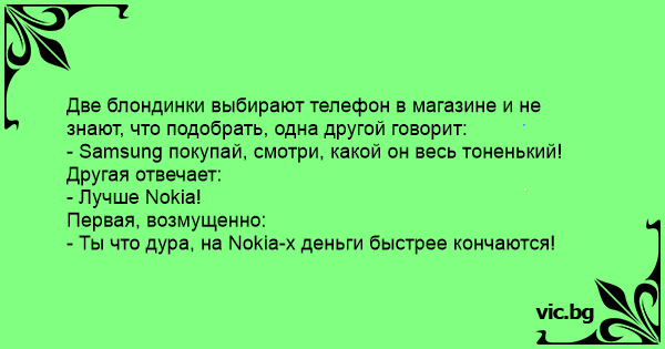 Две блондинки выбирают телефон в магазине и не знают, что подобрать, одна другой говорит:
