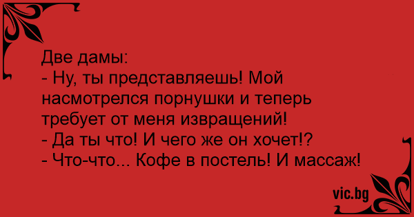 - Ну, ты представляешь! Мой насмотрелся порнушки и теперь требует от меня извращений!
