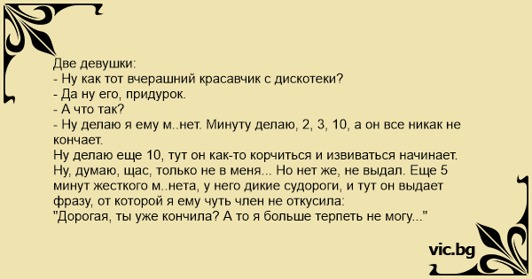 - Ну делаю я ему м..нeт. Минуту делаю, 2, 3, 10, а он все никак не кончает.
