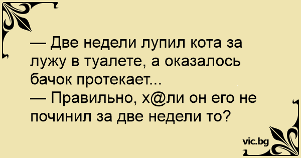 — Две недели лупил кота за лужу в туалете, а оказалось бачок протекает...<br />— Правильно, х@ли он его не починил за две недели то?