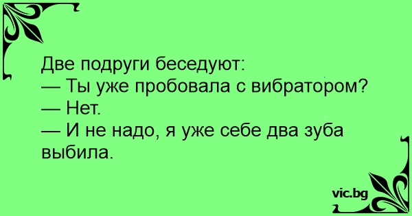Две подружки: - Ты с вибратором пробовала когда-нибудь? - Нет. - И не пробуй, я себе 2 зуба выбила!