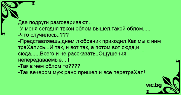 -Представляешь,днем любовник приходил.Как мы с ним тpaXались...И так, и вот так, а потом вот сюда,и сюда......Всего и не рассказать..Ощущения непередаваемые...!!!