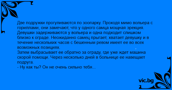 Девушки задерживаются у вольера и одна подходит слишком близко к ограде. Неожиданно самец прыгает, хватает девушку и в течение нескольких часов с бешенным ревом имеет ее во всех возможных позициях.