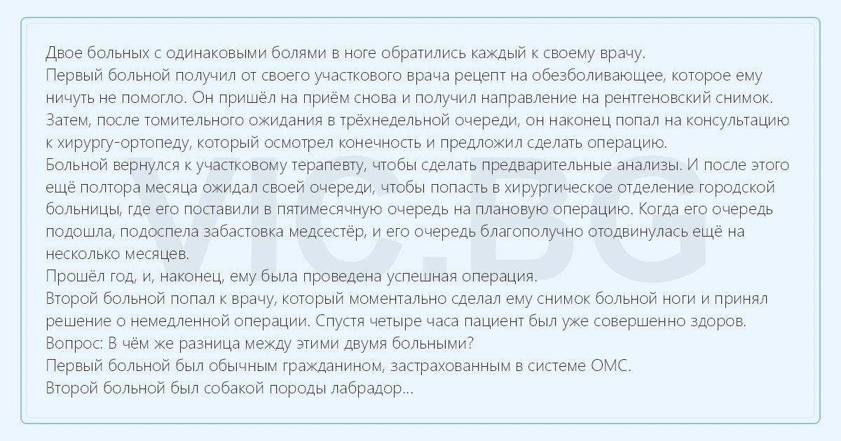 Двое больных с одинаковыми болями в ноге обратились каждый к своему врачу. Первый больной получил от своего участкового врача рецепт на обезболивающее, которое ему ничуть не помогло. Он пришёл на приём снова и получил направление на рентгеновский снимок. Затем, после томительного ожидания в трёхнедельной очереди, он наконец попал на консультацию к хирургу-ортопеду, который осмотрел конечность и предложил сделать операцию. Больной вернулся к участковому терапевту, чтобы сделать предварительные анализы. И после этого ещё полтора месяца ожидал своей очереди, чтобы попасть в хирургическое отделение городской больницы, где его поставили в пятимесячную очередь на плановую операцию. Когда его очередь подошла, подоспела забастовка медсестёр, и его очередь благополучно отодвинулась ещё на несколько месяцев. Прошёл год, и, наконец, ему была проведена успешная операция. Второй больной попал к врачу, который моментально сделал ему снимок больной ноги и принял решение о немедленной операции. Спустя четыре часа пациент был уже совершенно здоров. Вопрос: В чём же разница между этими двумя больными? Первый больной был обычным гражданином, застрахованным в системе ОМС. Второй больной был собакой породы лабрадор...