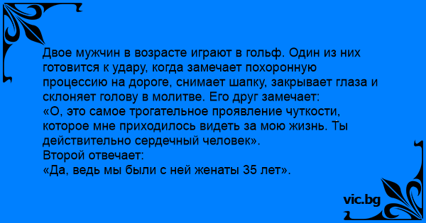 To mannfolk står og spiller golf, og den ene skal til å slå ballen i hullet, da han ser et begravelsesopptog. Han tar da av seg sin hatt og bøyer hodet. Hans kammerat sier overrasket: - Jeg viste...