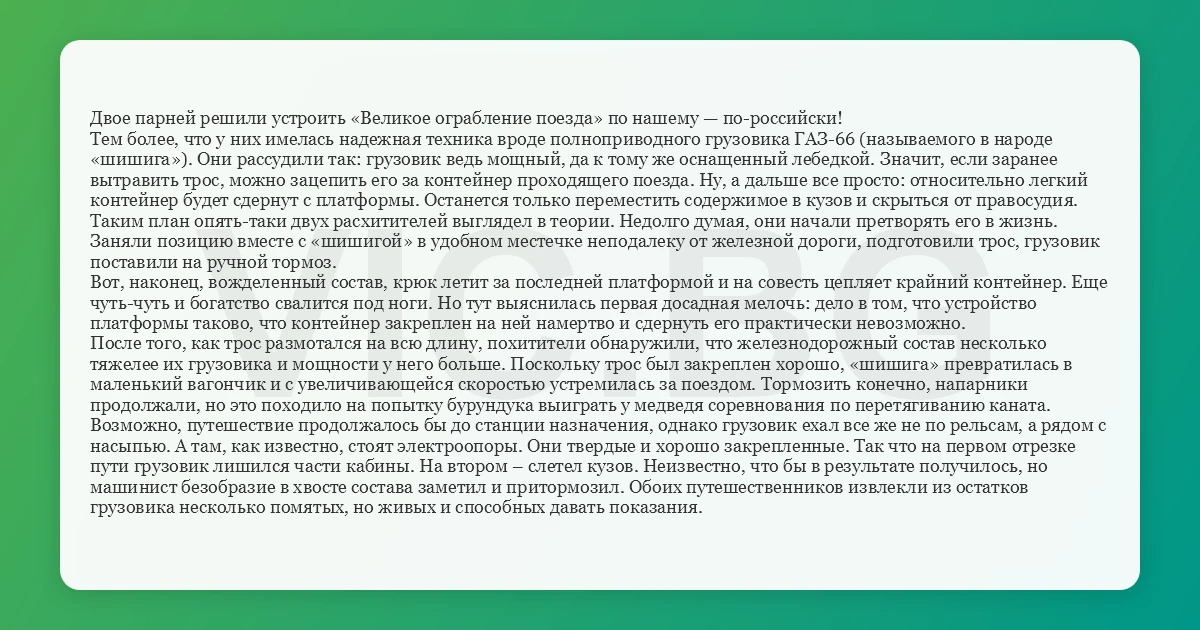 Двое парней решили устроить «Великое ограбление поезда» по нашему — по-российски! Тем более, что у них имелась надежная техника вроде полноприводного грузовика ГАЗ-66 (называемого в народе «шишига»). Они рассудили так: грузовик ведь мощный, да к тому же оснащенный лебедкой. Значит, если заранее вытравить трос, можно зацепить его за контейнер проходящего поезда. Ну, а дальше все просто: относительно легкий контейнер будет сдернут с платформы. Останется только переместить содержимое в кузов и скрыться от правосудия. Таким план опять-таки двух расхитителей выглядел в теории. Недолго думая, они начали претворять его в жизнь. Заняли позицию вместе с «шишигой» в удобном местечке неподалеку от железной дороги, подготовили трос, грузовик поставили на ручной тормоз. Вот, наконец, вожделенный состав, крюк летит за последней платформой и на совесть цепляет крайний контейнер. Еще чуть-чуть и богатство свалится под ноги. Но тут выяснилась первая досадная мелочь: дело в том, что устройство платформы таково, что контейнер закреплен на ней намертво и сдернуть его практически невозможно. После того, как трос размотался на всю длину, похитители обнаружили, что железнодорожный состав несколько тяжелее их грузовика и мощности у него больше. Поскольку трос был закреплен хорошо, «шишига» превратилась в маленький вагончик и с увеличивающейся скоростью устремилась за поездом. Тормозить конечно, напарники продолжали, но это походило на попытку бурундука выиграть у медведя соревнования по перетягиванию каната. Возможно, путешествие продолжалось бы до станции назначения, однако грузовик ехал все же не по рельсам, а рядом с насыпью. А там, как известно, стоят электроопоры. Они твердые и хорошо закрепленные. Так что на первом отрезке пути грузовик лишился части кабины. На втором – слетел кузов. Неизвестно, что бы в результате получилось, но машинист безобразие в хвосте состава заметил и притормозил. Обоих путешественников извлекли из остатков грузовика несколько помятых, но живых и способных давать показания.