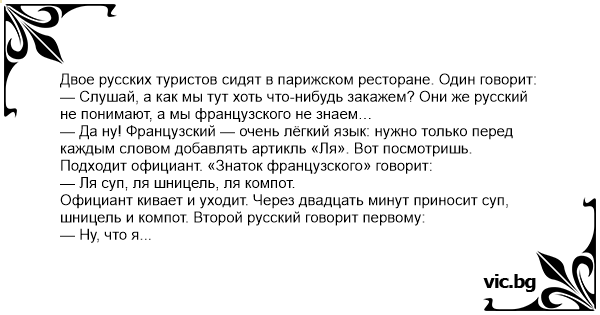 Отива българин във Франция с приятели, сядат в ресторант. Той започва да поръчва: