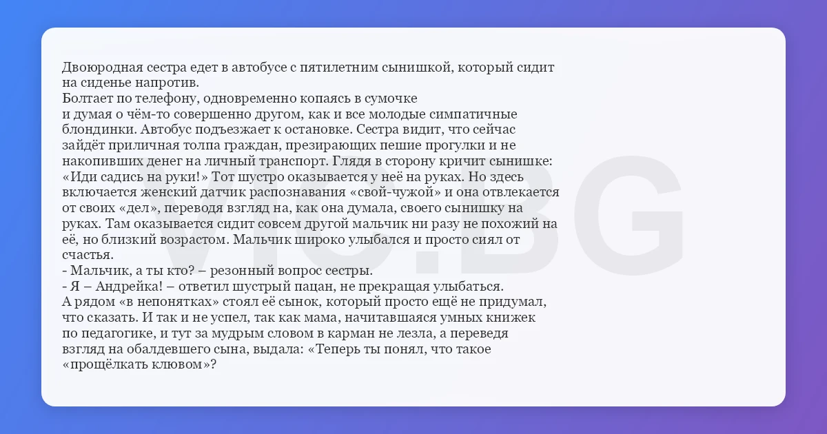 Двоюродная сестра едет в автобусе с пятилетним сынишкой, который сидит на сиденье напротив. Болтает по телефону, одновременно копаясь в сумочке и думая о чём-то совершенно другом, как и все молодые симпатичные блондинки. Автобус подъезжает к остановке. Сестра видит, что сейчас зайдёт приличная толпа граждан, презирающих пешие прогулки и не накопивших денег на личный транспорт. Глядя в сторону кричит сынишке: «Иди садись на руки!» Тот шустро оказывается у неё на руках. Но здесь включается женский датчик распознавания «свой-чужой» и она отвлекается от своих «дел», переводя взгляд на, как она думала, своего сынишку на руках. Там оказывается сидит совсем другой мальчик ни разу не похожий на её, но близкий возрастом. Мальчик широко улыбался и просто сиял от счастья. - Мальчик, а ты кто? – резонный вопрос сестры. - Я – Андрейка! – ответил шустрый пацан, не прекращая улыбаться. А рядом «в непонятках» стоял её сынок, который просто ещё не придумал, что сказать. И так и не успел, так как мама, начитавшаяся умных книжек по педагогике, и тут за мудрым словом в карман не лезла, а переведя взгляд на обалдевшего сына, выдала: «Теперь ты понял, что такое «прощёлкать клювом»?