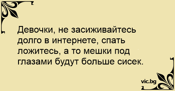 Девочки, не засиживайтесь долго в интернете, спать ложитесь, а то мешки под глазами будут больше сисек.