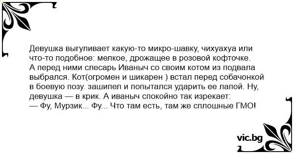 А перед ними слесарь Иваныч со своим котом из подвала выбрался. Кот(огромен и шикарен ) встал перед собачонкой в боевую позу. зашипел и попытался ударить ее лапой. Ну, девушка — в крик. А иваныч спокойно так изрекает: