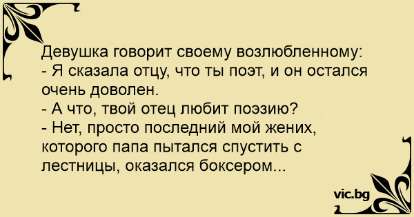 - Нет, просто последний мой жених, которого папа пытался спустить с лестницы, оказался боксером...
