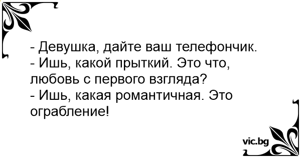 — Дівчино, дайте ваш телефончик. — Ти бач, який спритний. Це що, любов із першого погляду? — Ти бач, яка спритна. Це пограбування!