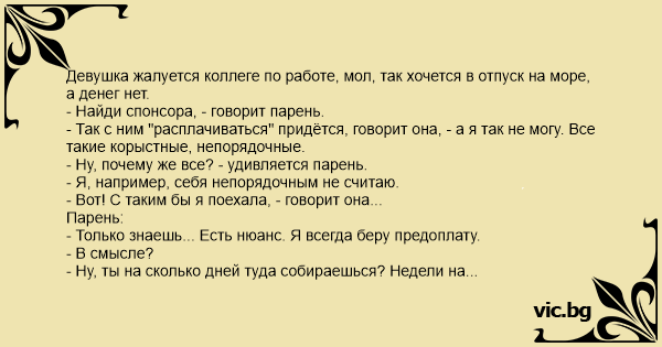 Девушка жалуется коллеге по работе, мол, так хочется в отпуск на море, а денег нет.