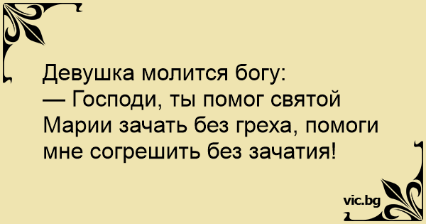 Девушка молится богу:<br />— Господи, ты помог святой Марии зачать без греха, помоги мне согрешить без зачатия!
