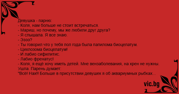 - Коля, я ещё хочу иметь детей. Мне вензаболевания, на xpен не нужны.