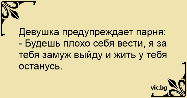 Девушка предупреждает парня: - Будешь плохо себя вести, я за тебя замуж выйду и жить у тебя останусь.
