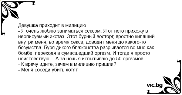 - Я очень люблю заниматься сексом. Я от него прихожу в неописуемый экстаз. Этот бурный восторг, яростно кипящий внутри меня, во время cekca, доводит меня до какого-то безумства. Буря дикого блаженства разрывается во мне как бомба, переходя в сумасшедший оргазм. И тогда я просто неистовствую… А за ночь я испытываю до 50 оргазмов.