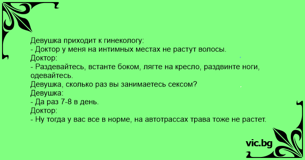 Mlada dama došla kod ginekologa. - "Doktore, pomagajte ! Otpale su mi sve stidne dlake." - "Koliko često imate seks?" - "Tri do četiri puta dnevno." - "Ne sekirajte se. Ni na autoputu nema trave."