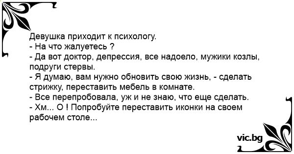 - Да вот доктор, депрессия, все надоело, мужики козлы, подруги стервы.