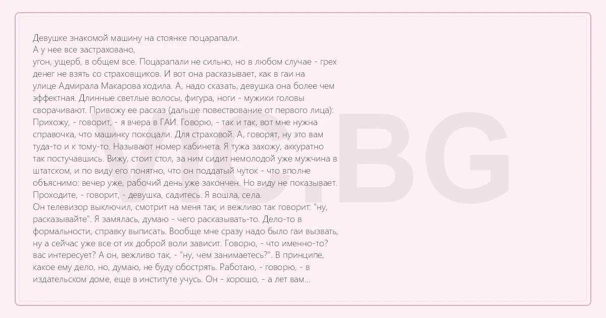 Девушке знакомой машину на стоянке поцарапали. А у нее все застраховано, угон, ущерб, в общем все. Поцарапали не сильно, но в любом случае - грех денег не взять со страховщиков. И вот она расказывает, как в гаи на улице Адмирала Макарова ходила. А, надо сказать, девушка она более чем эффектная. Длинные светлые волосы, фигура, ноги - мужики головы сворачивают. Привожу ее расказ (дальше повествование от первого лица): Прихожу, - говорит, - я вчера в ГАИ. Говорю, - так и так, вот мне нужна справочка, что машинку покоцали. Для страховой. А, говорят, ну это вам туда-то и к тому-то. Называют номер кабинета. Я тужа захожу, аккуратно так постучавшись. Вижу, стоит стол, за ним сидит немолодой уже мужчина в штатском, и по виду его понятно, что он поддатый чуток - что вполне объяснимо: вечер уже, рабочий день уже закончен. Но виду не показывает. Проходите, - говорит, - девушка, садитесь. Я вошла, села. Он телевизор выключил, смотрит на меня так, и вежливо так говорит: "ну, расказывайте". Я замялась, думаю - чего расказывать-то. Дело-то в формальности, справку выписать. Вообще мне сразу надо было гаи вызвать, ну а сейчас уже все от их доброй воли зависит. Говорю, - что именно-то? вас интересует? А он, вежливо так, - "ну, чем занимаетесь?". В принципе, какое ему дело, но, думаю, не буду обострять. Работаю, - говорю, - в издательском доме, еще в институте учусь. Он - хорошо, - а лет вам сколько? Я называю. И со одной стороны, вопросы вроде левые, ну а другой - видно, что вечер уже, мужику домой надо, опять же, выпить хочется, а он заставляет себя изо всех сил со мной разговаривать, и виду не показывать, как плохо ему. И, вежливо так, - а на кого учитесь? Я - на юриста, то да се. Дальше - больше, вопросы посыпались: спрашивает, какой курс, что дальше хочу по жизни делать. Минут через пятьнадцать я уж совсем в тупике, сижу злая, думаю, - еще один вопрос из этой серии, - развернусь и уйду. Хватит с меня уже сексуально озабоченных гаишников. Но все по-другому вышло, в конце то. Мужик, в итоге, сидел молча, думал-думал, смотрел на меня... а потом как спросит, аккуратно так, тактично: "А вы уверены, - говорит, - девушка, что вы хотите работать в милиции?".