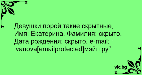 Девушки порой такие скрытные, Имя: Екатерина. Фамилия: скрыто. Дата рождения: скрыто. е-mаil: ivаnovа[emailprotected]мэйл.ру"<br />