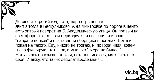 Жил я тогда в Бескудниково. А на Дмитровке по дороге в центр, есть хитрый поворот на Б. Академическую улицу. Он правый на светофоре, так вот там периодически вывешивали знак "направо нельзя" и выставляли сборщика в погонах. Вот я и попал на такого. Еду, никого не трогаю, и, поворачивая, краем глаза фиксирую этот знак, с мыслью "вчера не было...". Натыкаюсь на взмах палочки, останавливаюсь, матерясь про себя. И вижу, что таких бедолаг вроде меня машин пять в очереди на разборки. Жду. Сборщик не торопится, жарко, лениво, потно ... Вылетает из-за поворота девятка с тонированными стеклами, тоже натыкается на палочку. Оттуда вылезает развеселый браток в шортах и шлепках, обвешаный цепурами, браслетами и т.д. Оценивает полминуты ситуацию. Следует диалог (как слышал, так и пишу). Браток (голосом полного придурка):